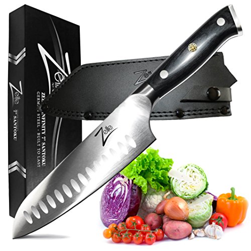 Product Highlight Zelite Infinity Santoku Knife 7 inch >> Alpha-Royal Series >> Best Quality German Steel - Razor Sharp, Superb Edge Retention, Stain & Corrosion Resistant Chef Knives, Ultra-Premium Leather Sheath